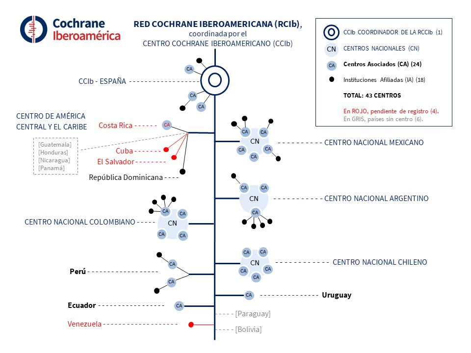 La Red Cochrane Iberoamericana (RCIb) está integrada por el Centro Cochrane Iberoamericano (CCIb) y las entidades (centros nacionales, centros asociados e instituciones afiliadas) presentes en 19 países de la región. Las instituciones que participan en la Red son un reflejo de la diversidad y el apoyo que dan a sus profesionales para mantener Cochrane viva y productiva en esta parte del mundo.