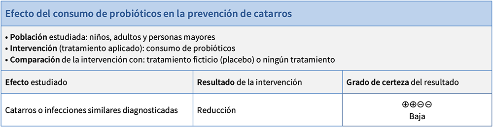 Una revisión Cochrane (ver "Fuente de la evidencia") ha resumido los resultados de los estudios que analizaron el efecto de consumir probióticos en la prevención del catarro.