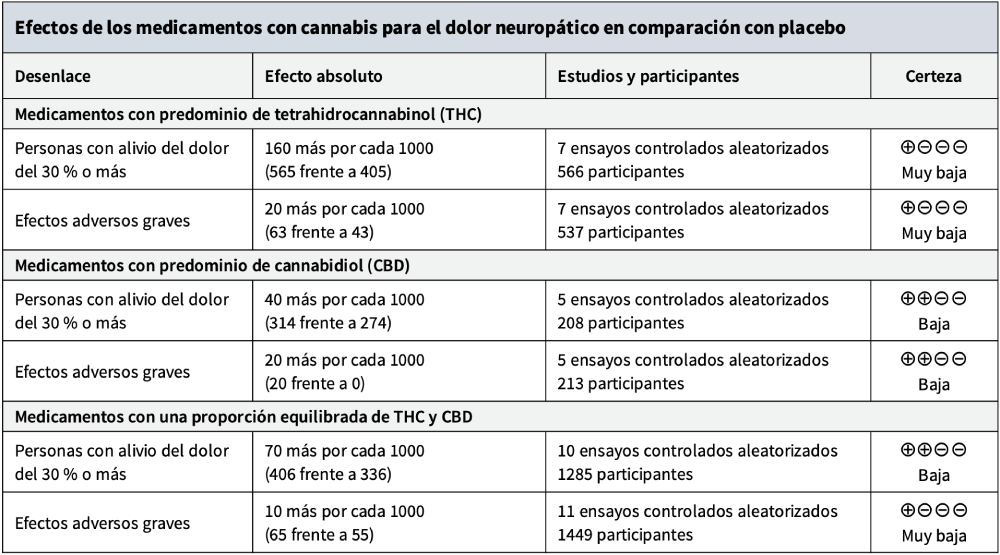 La evidencia científica disponible es limitada y de certeza baja o muy baja. Por ello, no se pueden establecer conclusiones firmes sobre los efectos beneficiosos y perjudiciales de los medicamentos con cannabis para el dolor neuropático, ya sean aquellos con predominio de tetrahidrocannabinol (THC), de cannabidiol (CBD) o con una proporción equilibrada de ambos.