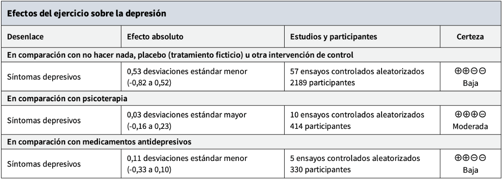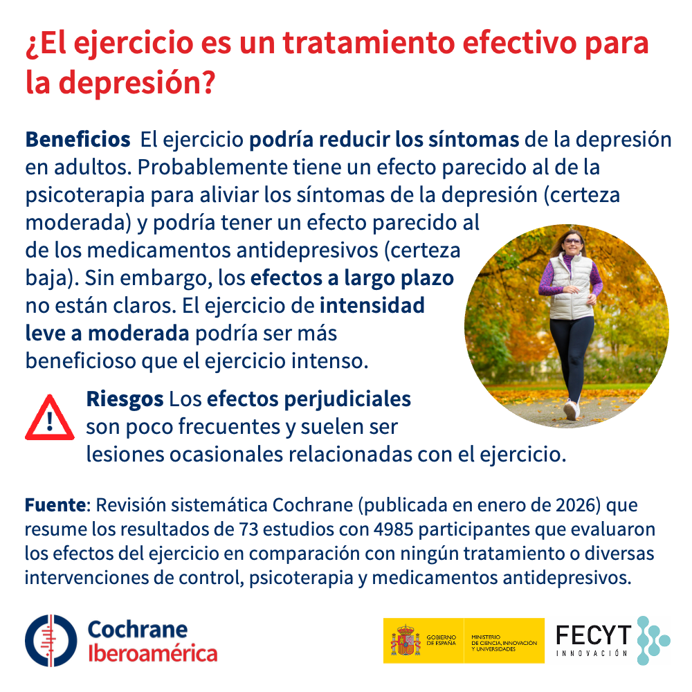 La depresión es una de las principales causas de mala salud y discapacidad en el mundo, y afecta a más de 280 millones de personas. El ejercicio es una intervención relativamente económica y accesible, que además aporta beneficios adicionales para la salud. Por ello, se ha propuesto como una posible opción terapéutica para la depresión. La pregunta es: ¿qué dice la evidencia científica sobre la eficacia del ejercicio para reducir los síntomas de la depresión?