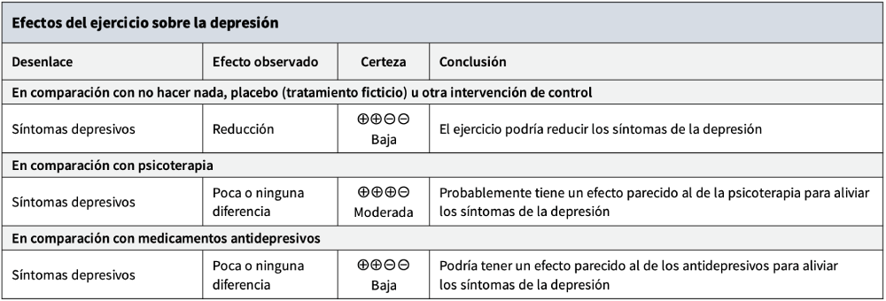 El ejercicio podría reducir los síntomas de la depresión en adultos. Probablemente tiene un efecto parecido al de la psicoterapia para aliviar los síntomas de la depresión (certeza moderada) y podría tener un efecto parecido al de los medicamentos antidepresivos (certeza baja).