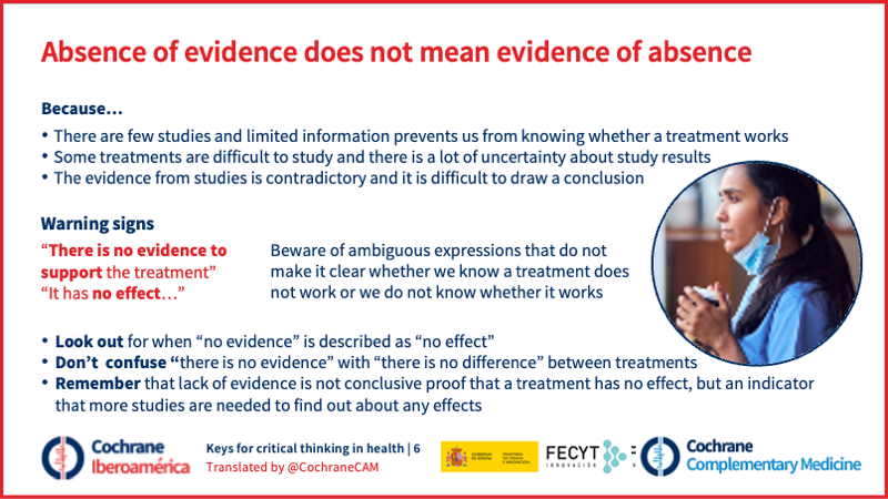 - Recuerda que la falta de evidencia no es la prueba concluyente de que un tratamiento no tiene efectos, sino más bien un indicador de que hacen falta más estudios de buena calidad para conocerlos