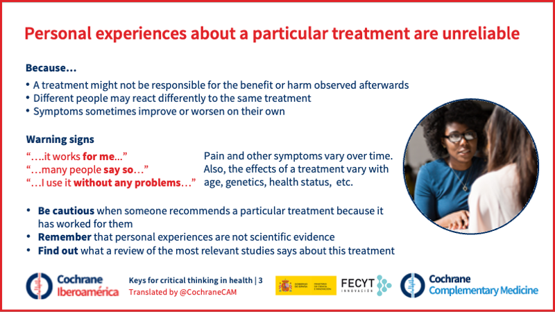 Los testimonios personales pueden ser muy ciertos. La salud de una persona puede mejorar o empeorar tras recibir un tratamiento de cualquier tipo (medicamento, dieta, psicoterapia, cirugía, ejercicios, etc.). Sin embargo, esto no significa que el beneficio o el daño se deba necesariamente al tratamiento, ni tampoco que otra persona vaya a reaccionar igual.