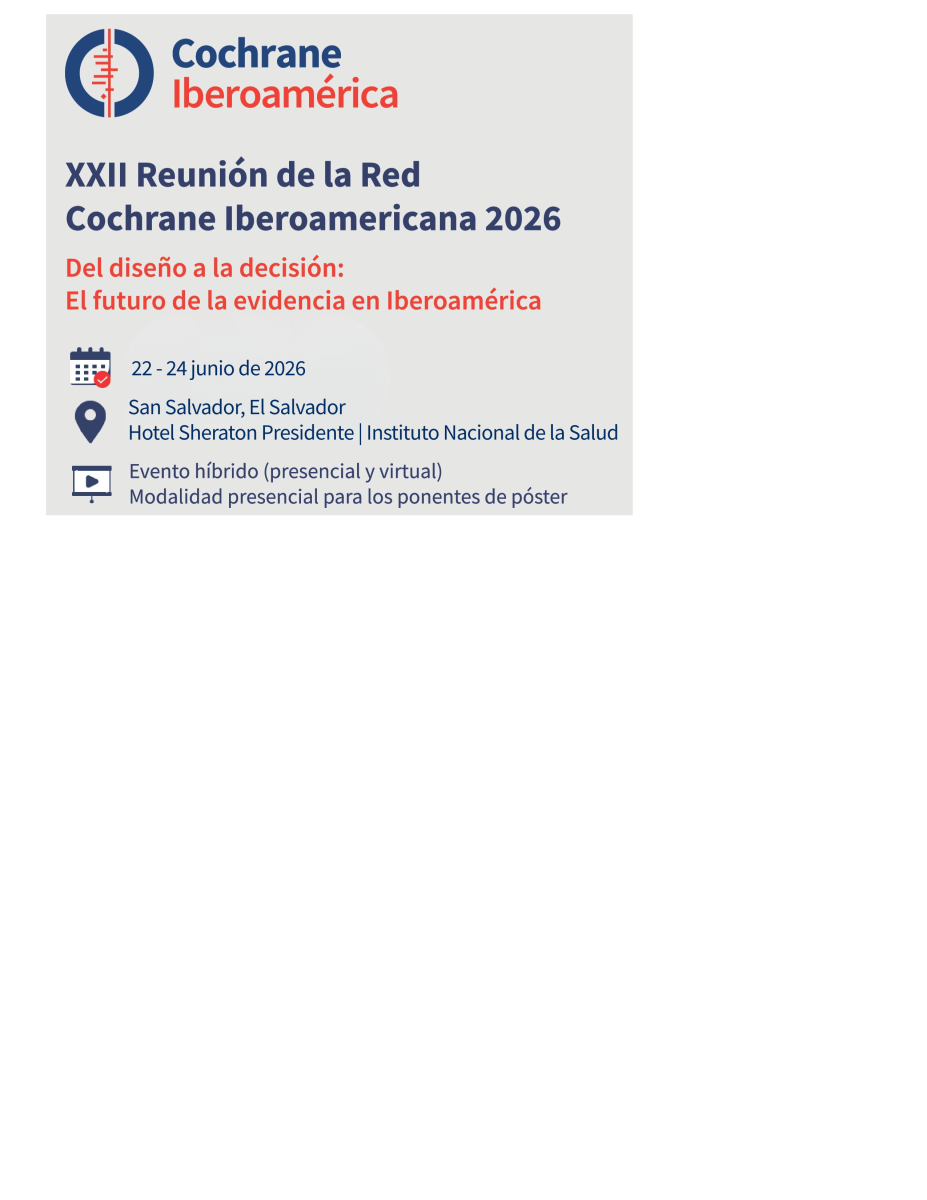 Los organizadores de la XXII reunión de la Red Cochrane Iberoamericana, que se celebrará en 2026 en El Salvador con el lema "Del diseño a la decisión: El futuro de la evidencia en Iberoamérica", han publicado las bases del congreso en la página web de la reunión anunciando que se ha abierto la convocatoria para presentar pósteres.
