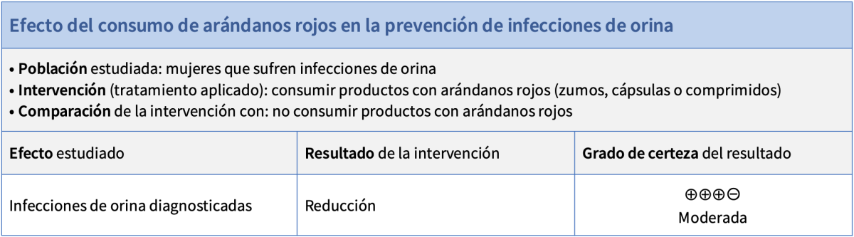 Conclusión: como la certeza de la evidencia es moderada, se concluye que el consumo de arándanos rojos probablemente reduce las infecciones de orina en mujeres (ver la infografía El lenguaje de la certeza).